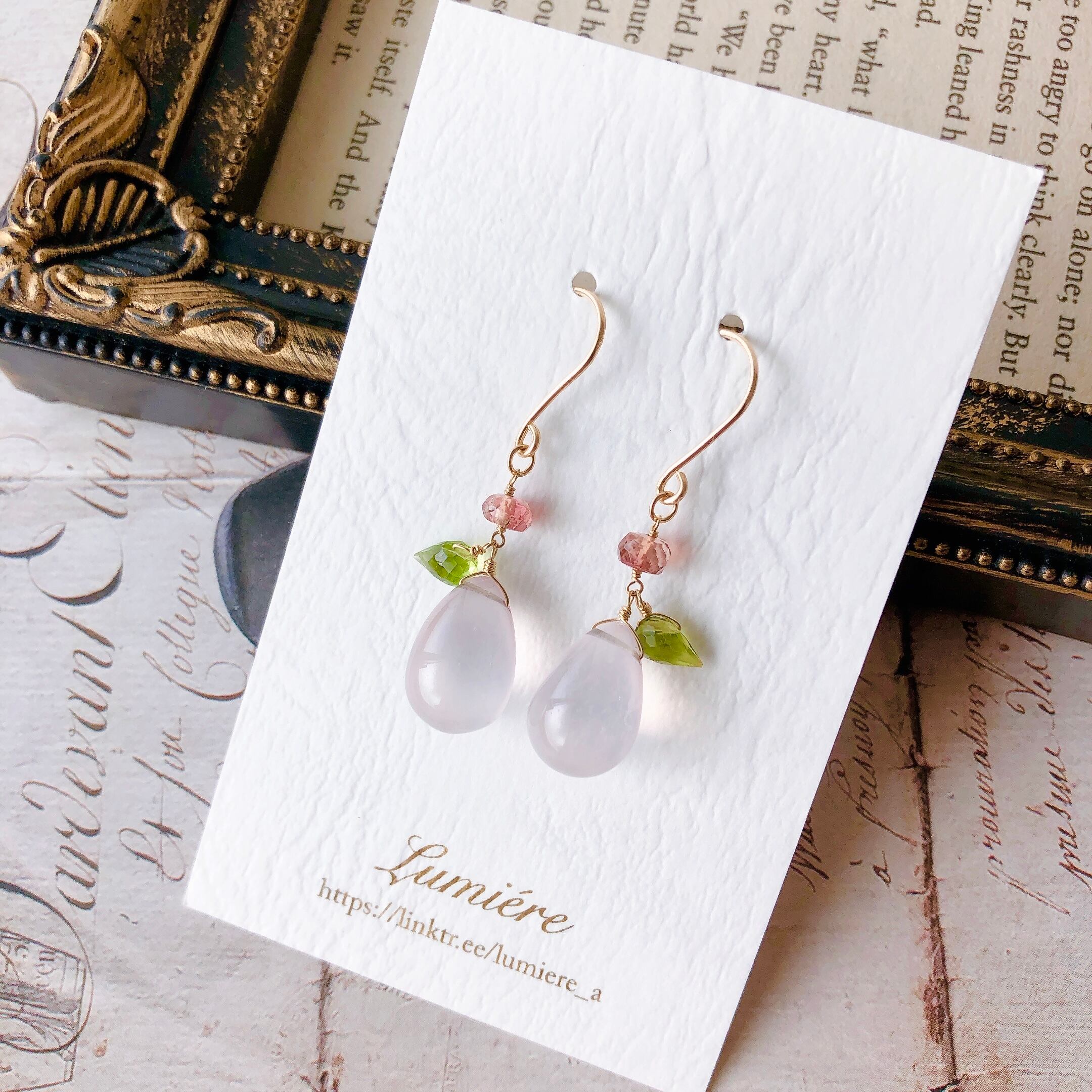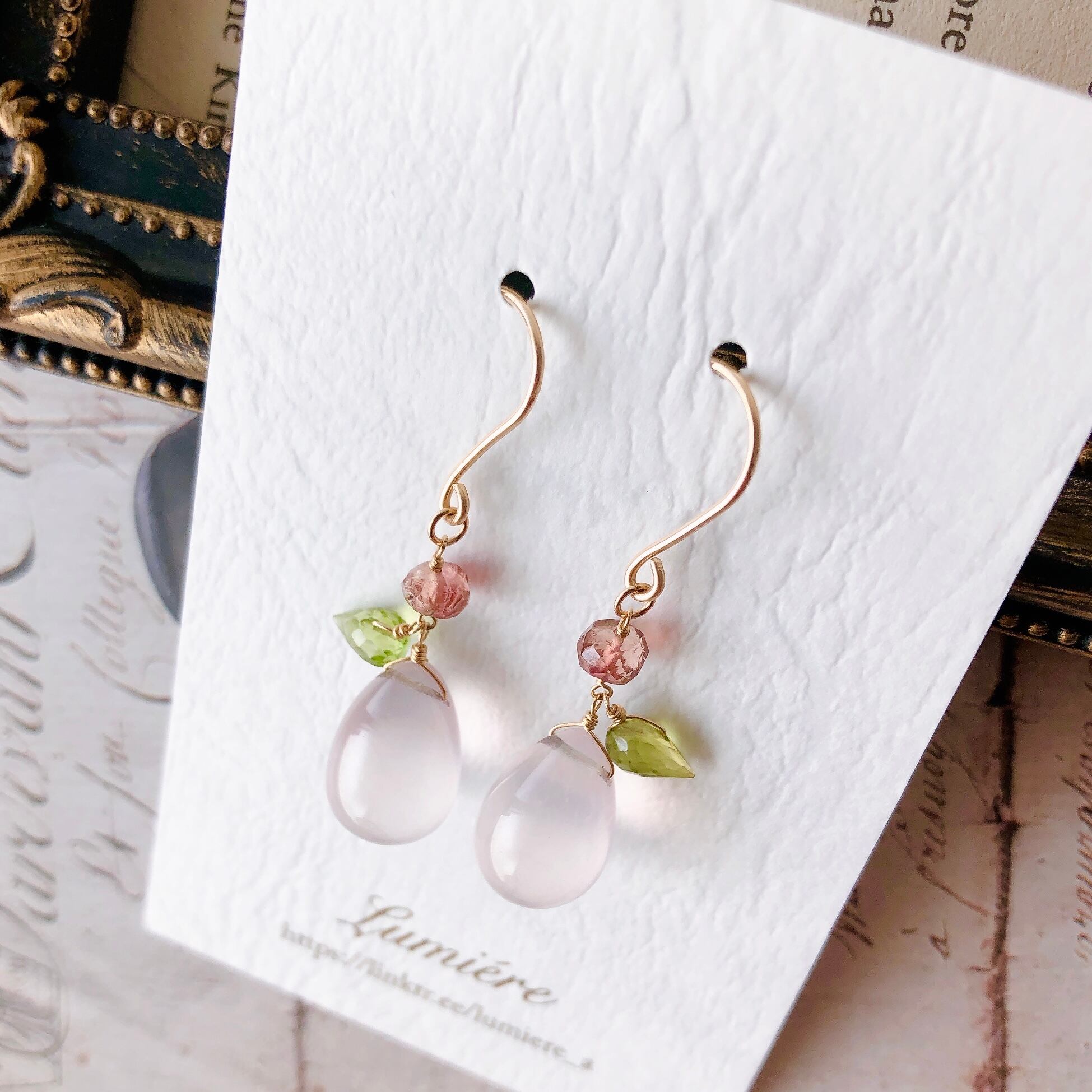 ぷっくり可愛らしいシルエットのローズクォーツに、葉っぱのようなペリドットをあしらい、まるでフルーツのようなピアスに仕上がりました。