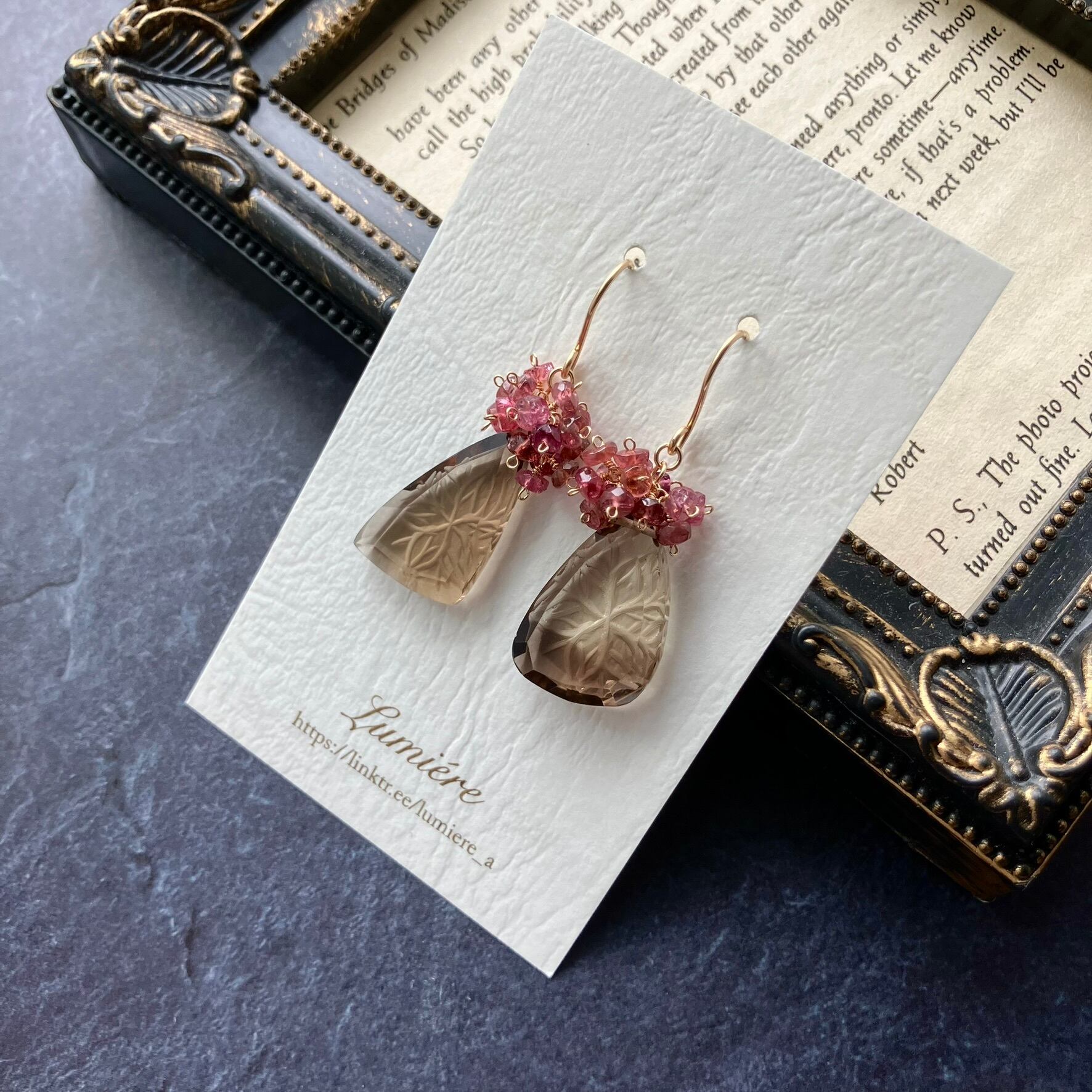 14kgf*バックカービングスモーキークォーツ&ピンクトルマリンのピアス