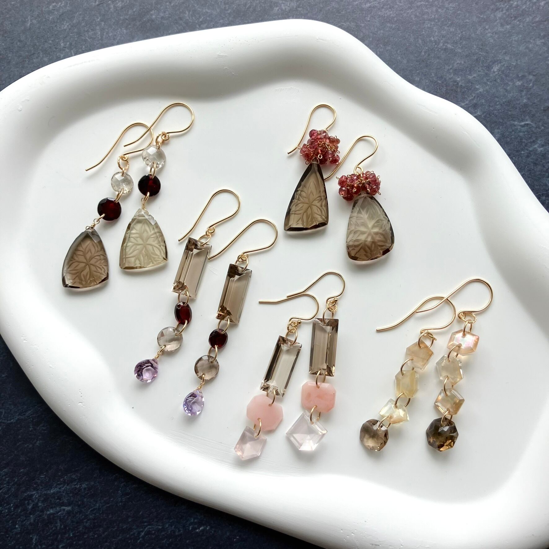 裏面に繊細なカービングを施したスモーキークォーツをメインに、小粒のピンクトルマリンをブーケのように合わせたピアスを仕立てました。