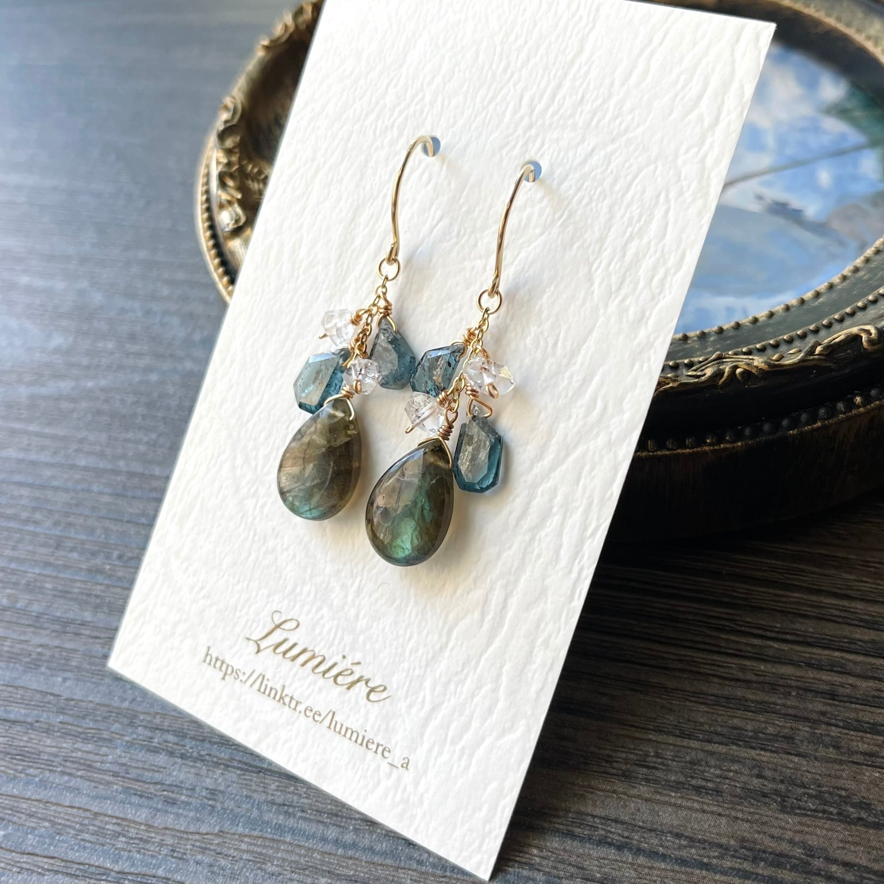 ペアシェイプのラブラドライトをメインに、モスカイヤナイト、ハーキマーダイヤモンドを合わせたピアスを仕立てました。