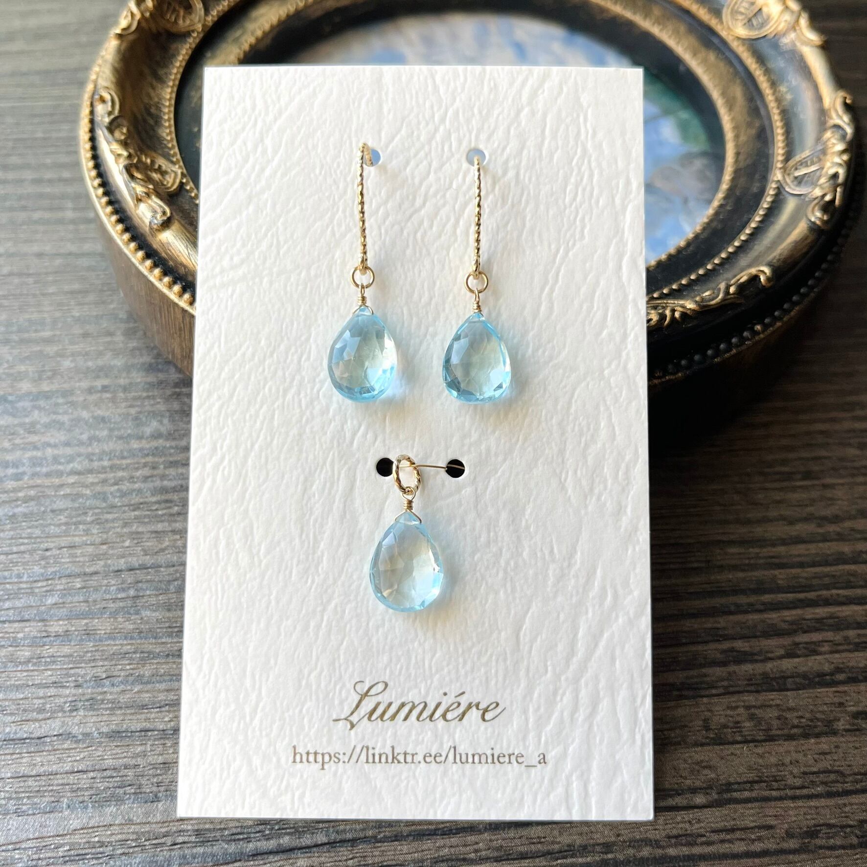 14kgf*スカイブルートパーズの一粒ピアス&ネックレストップ