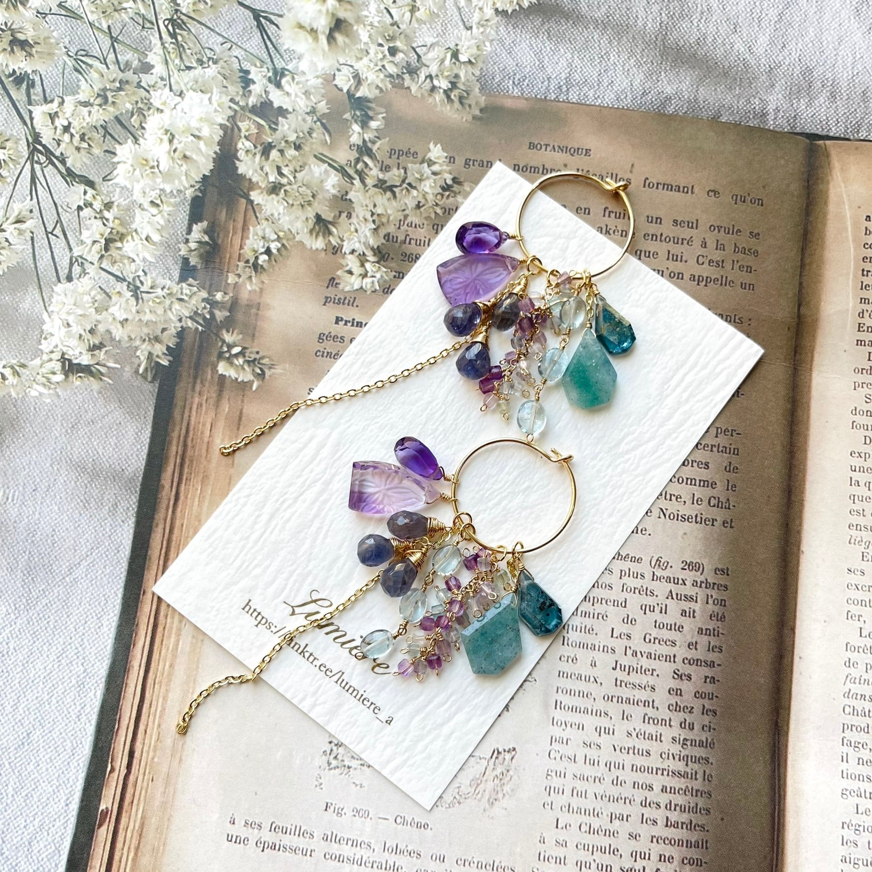 繊細なカービングが施されたアメジストをメインに、さまざまな天然石を使用したフープピアスを仕立てました。